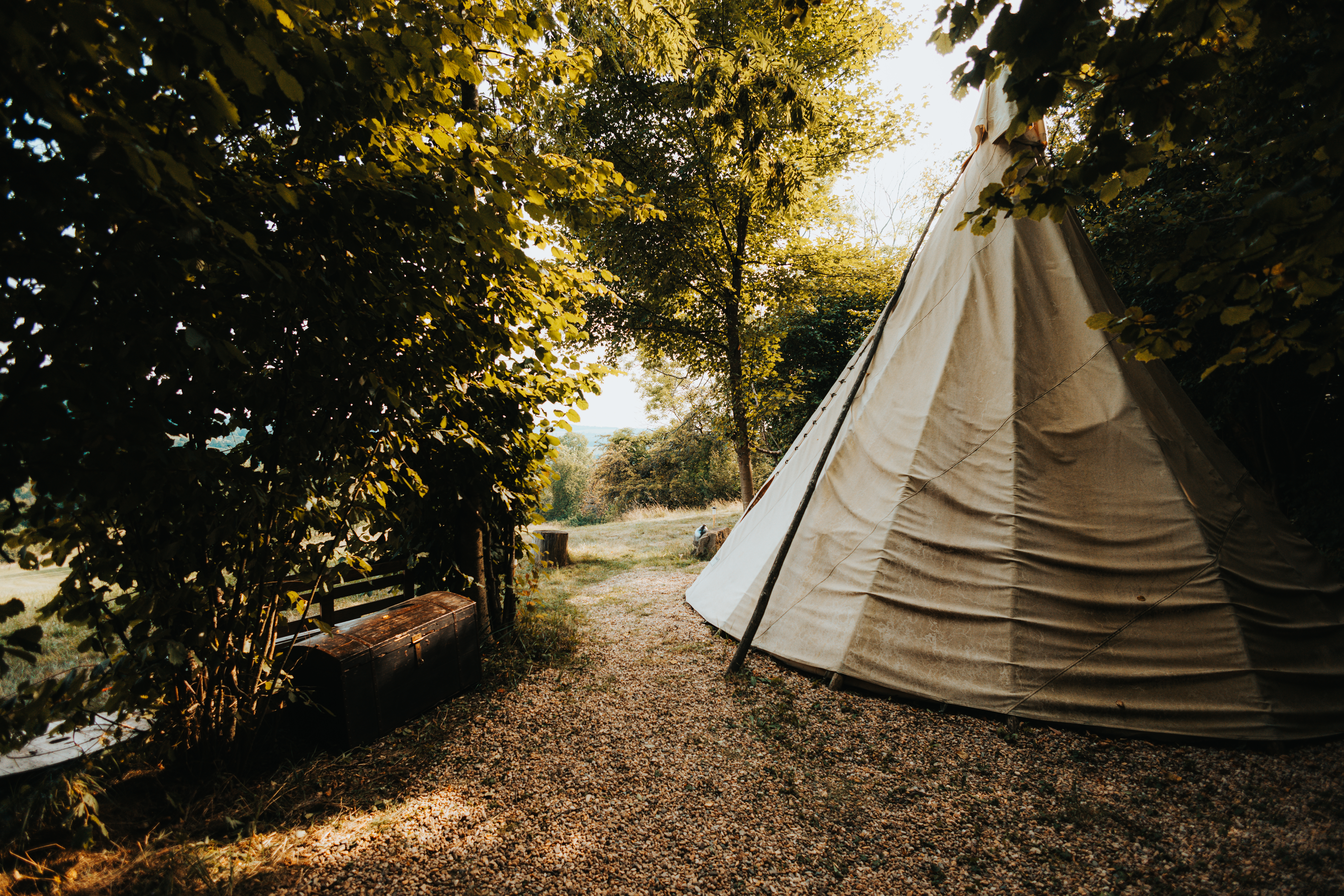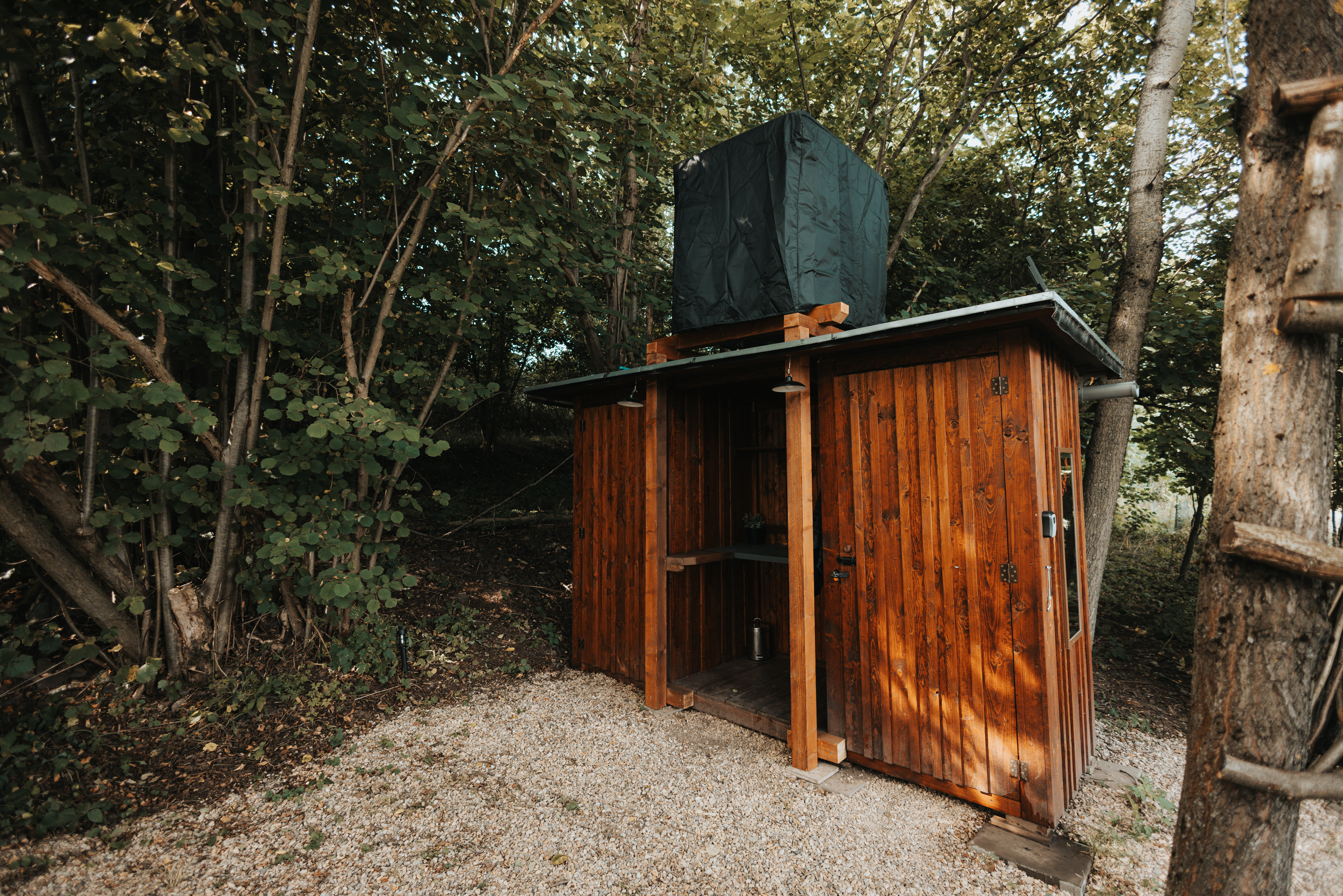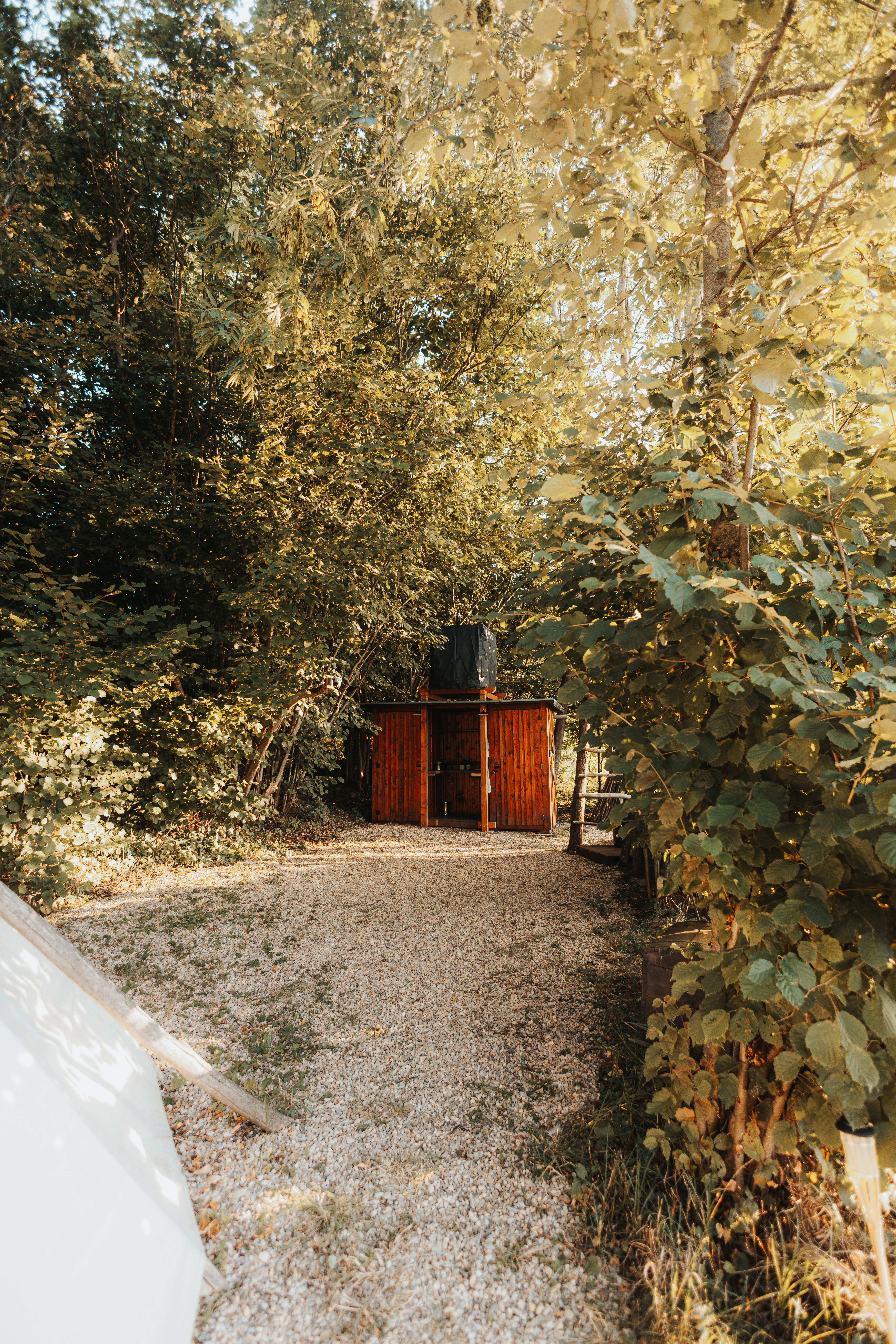 I venku na Vás čeká vše, co zpříjemní pobyt v přírodě. Na terase s posezením můžete snídat s výhledem na louky a večer si užít praskání ohně u přírodního ohniště s grilem. Součástí vybavení je i venkovní tlaková sprcha s krásným výhledem na okolní přírodu a suchá toaleta jen pár kroků od teepee.
