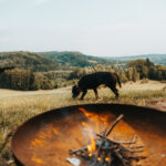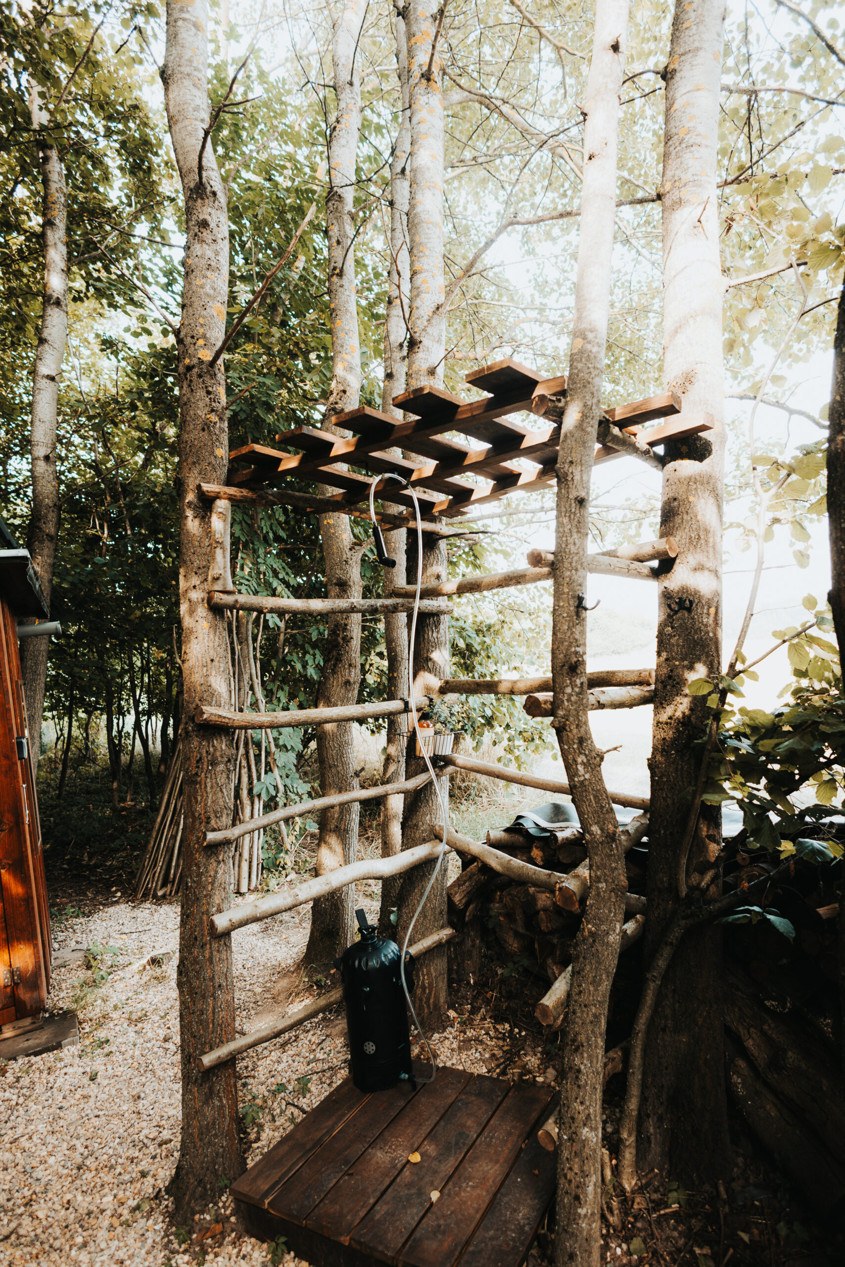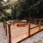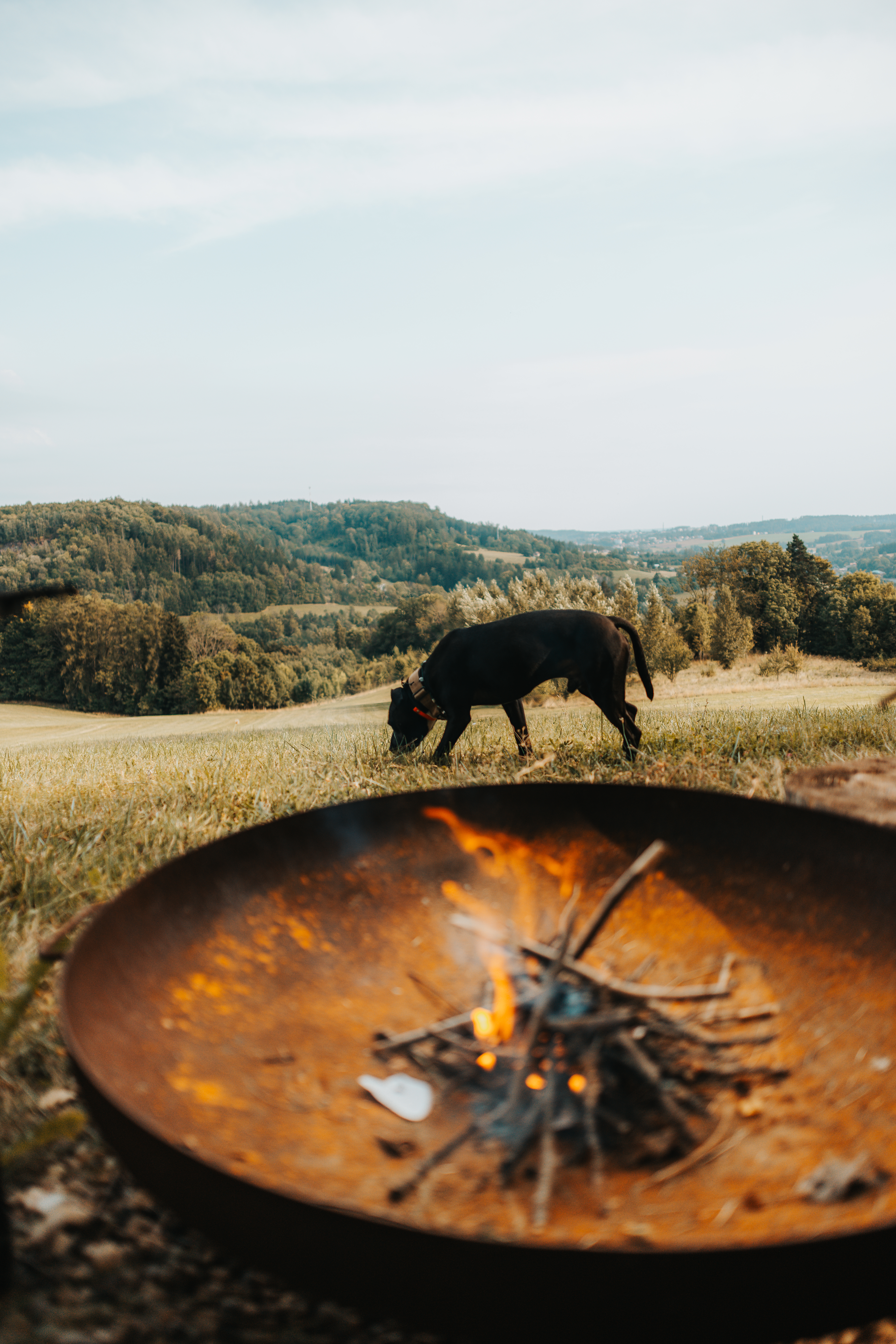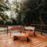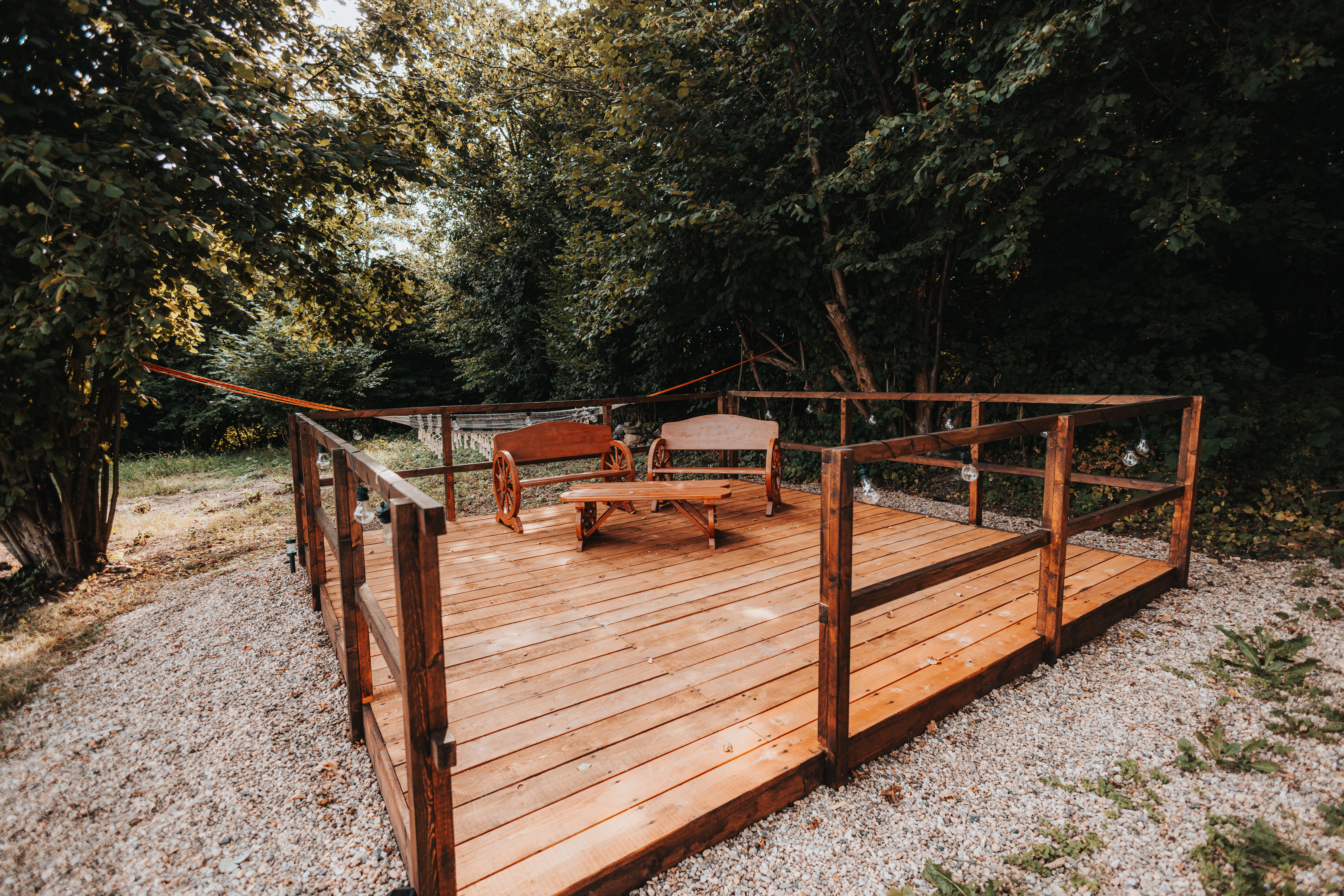 I venku na Vás čeká vše, co zpříjemní pobyt v přírodě. Na terase s posezením můžete snídat s výhledem na louky a večer si užít praskání ohně u přírodního ohniště s grilem. Součástí vybavení je i venkovní tlaková sprcha s krásným výhledem na okolní přírodu a suchá toaleta jen pár kroků od teepee.